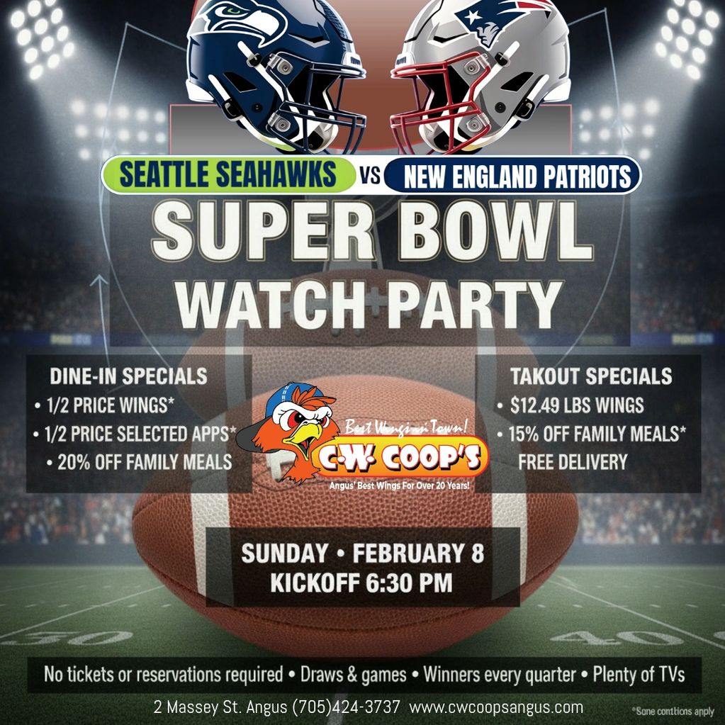 Catch the Super Bowl Watch Party at CW Coop’s on Sunday, February 8 with kickoff at 6:30 PM. Come early, grab a table, and watch the game on plenty of TVs with draws, games, and winners every quarter—no tickets or reservations required.
