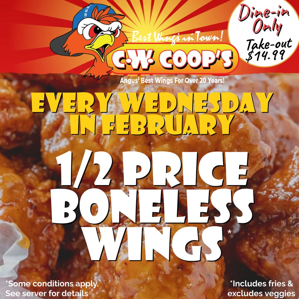 Every Wednesday in February, we’re turning wing night into a full-on tradition at CW Coop’s -Angus with 1/2 Price Boneless Wings—dine-in only. Pick your flavour, grab a seat, and make it a midweek hang with your crew (because Wednesdays deserve better).